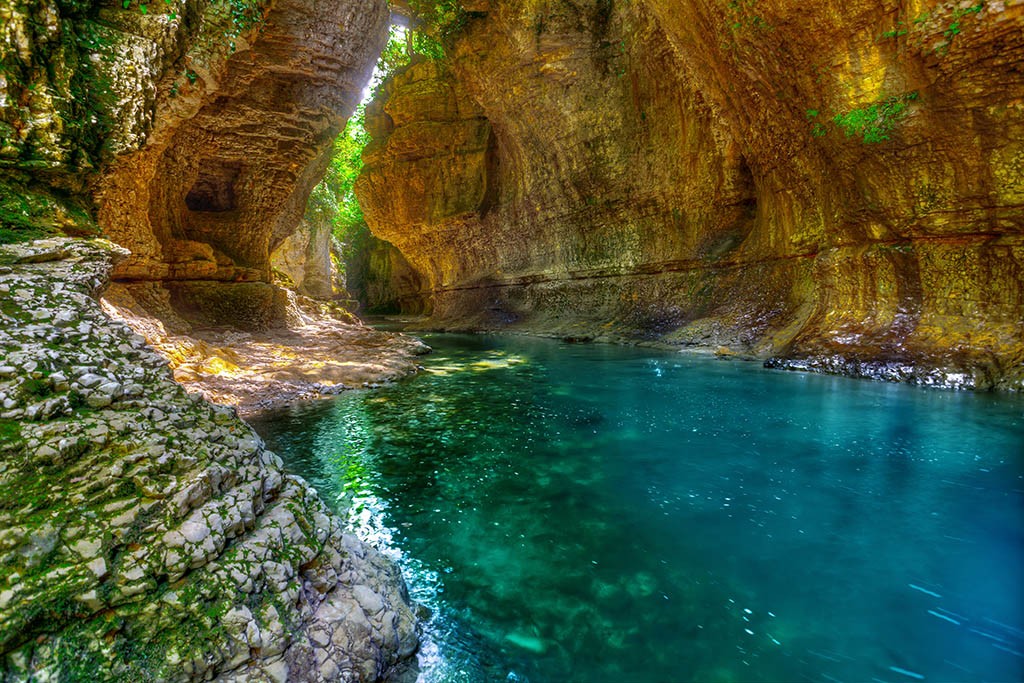 Каньон Мартвили – уникальный памятник природы со следами доисторических животных. Скалистые берега, дикая растительность, большой водопад, спадающий с огромной высоты, много маленьких водопадов и ручейков, которые образует бирюзовые озера с прозрачной водой - это прекрасное и необыкновенное творение природы, от красоты которого захватывает дух. Здесь растут красивые лианы, а стены каньона покрывают многолетние мхи.
