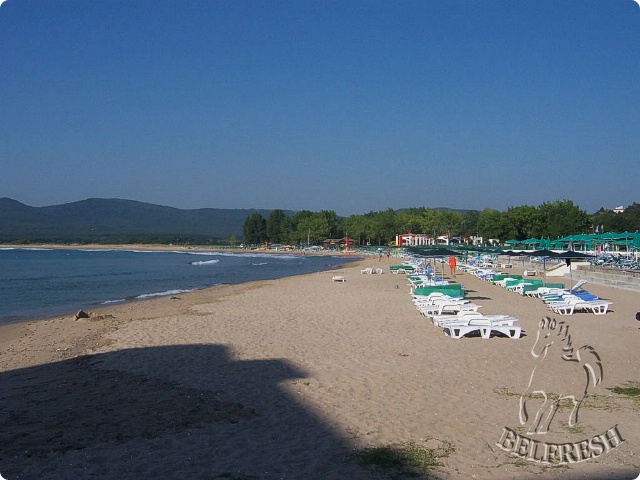 Пляжная полоса: широкая и длинная, с мелким песком и мелкой бухтой рядом с берегом, охраняемая зона; зонтики, лежаки, душевые, раздевалки, пляжные полотенца, станция водного спорта и медицинский пункт.