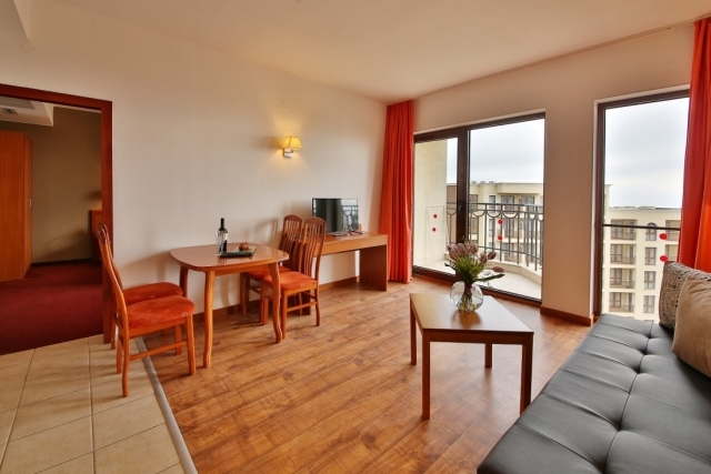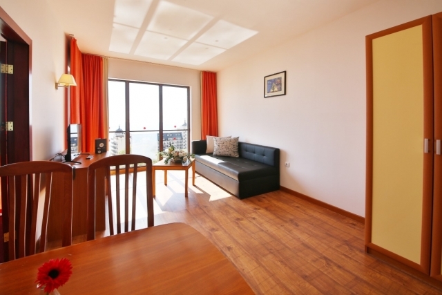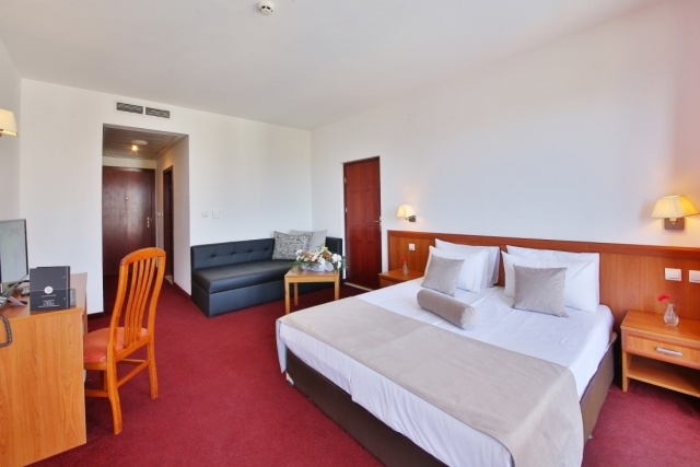 DOUBLE ROOM – PREMIUM- двуспальная кровать и раскладной диван, стол, кондиционер, 43”LCD SMART TV со спутниковым телевидением, сейф, телефон, мини-холодильник, ванная комната с феном и косметическим набором, электрический чайник, одноразовый набор кофе и чая, халаты и тапочки, балкон.