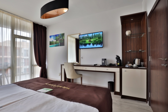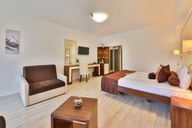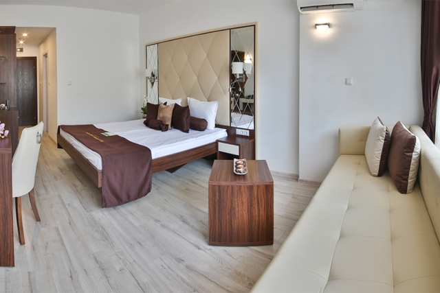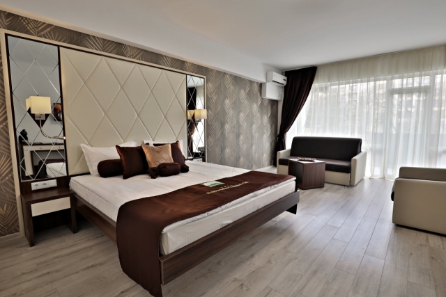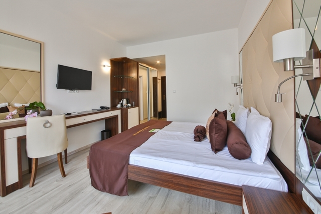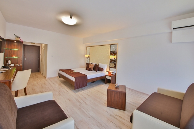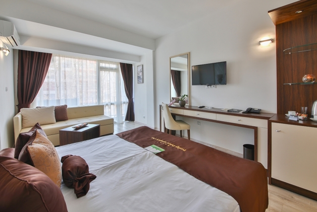 DOUBLE ROOM - DELUXE - min 2; max 2+2 or 3 adt- Двуспальная кровать, раскладной диван, стол, индивидуальный кондиционер, 32’’LCD телевизор со спутниковым телевидением, сейф, телефон, ванная комната (с ванной или душевой кабиной) с феном и косметическим набором, мини-холодильник, электрический чайник, одноразовый запас кофе и чая, халаты и тапочки, балкон. Отель предлагает двухместные номера Делюкс с смежной дверью.