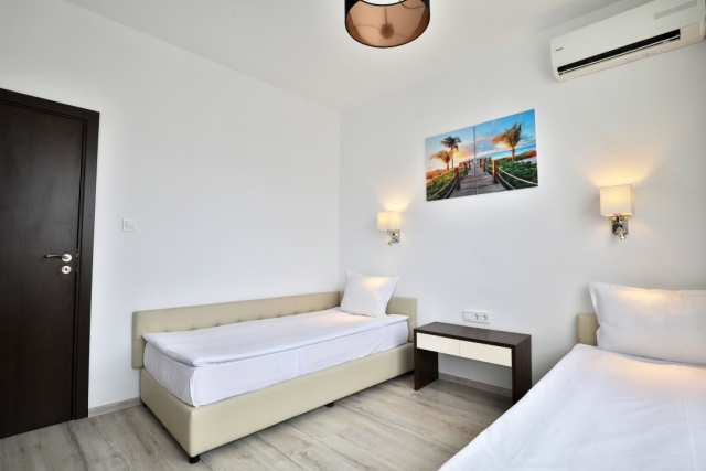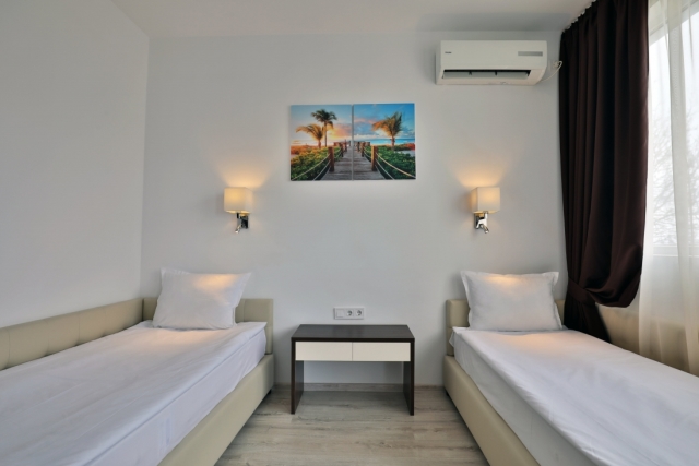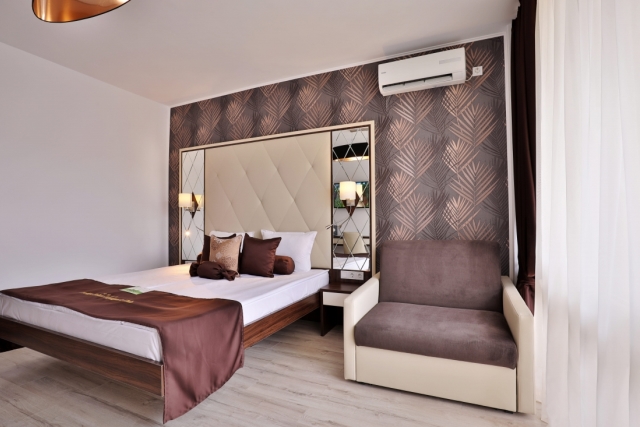 DOUBLE ROOM - PREMIUM - min 2+2; max 3+2 or 3 adt- все номера на самом верхнем этаже: двуспальная кровать, раскладной диван/ кресло, стол, индивидуальный кондиционер, 43” LCD телевизор SMART TV со спутниковым телевидением, сейф, телефон, мини-холодильник, ванная комната с феном и косметическим набором, электрический чайник, одноразовый запас кофе и чая, халаты и тапочки, балкон.
