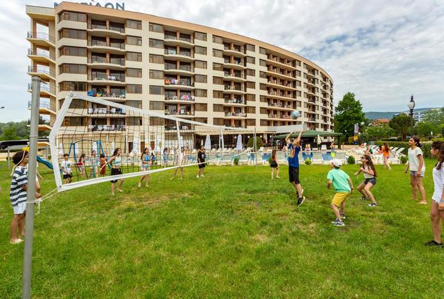 Международный детский и молодежный лагерь «Посейдон» - это красивый, необычайной архитектуры в виде ладьи апартаментный отель 4*, который находится в элитной части курорта на 2-й линии вблизи моря у подножия гор Стара Планина, покрытых зелеными лесами. Данная часть курорта славится своим микроклиматом - сочетание чистого горного со свежим морским воздухом, подходящих для оздоровления туристов. В этом месте сосредоточены в основном 5* и 4* гостиницы.